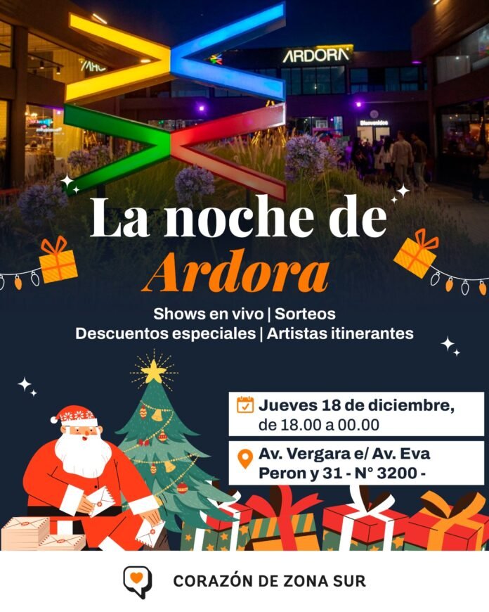 Como antesala de las Fiestas de fin de año, este jueves 18 diciembre, los y las berazateguenses podrán disfrutar de “La Noche de Ardora”: una gran jornada de descuentos para las compras navideñas, espectáculos en vivo, sorteos y la presentación de artistas itinerantes. Organizado por el paseo de compras Ardora con el acompañamiento de la Municipalidad de Berazategui, a través de la Secretaría de Trabajo, el evento se desarrollará en el Centro Comercial del Complejo Ardora (Av. Vergara e/ Av. Eva Perón y 31 -N° 3200-), de 18.00 a 00.00.